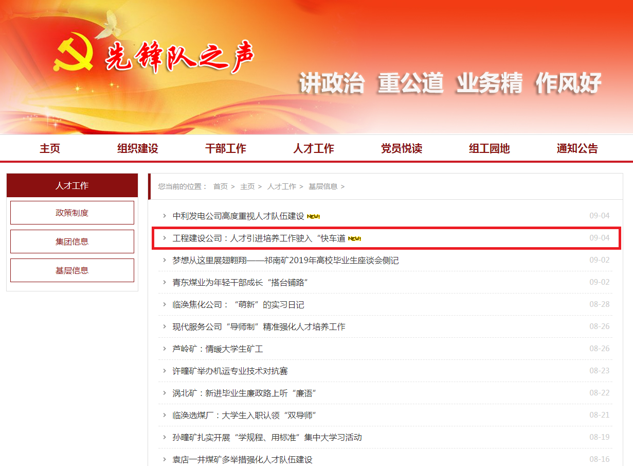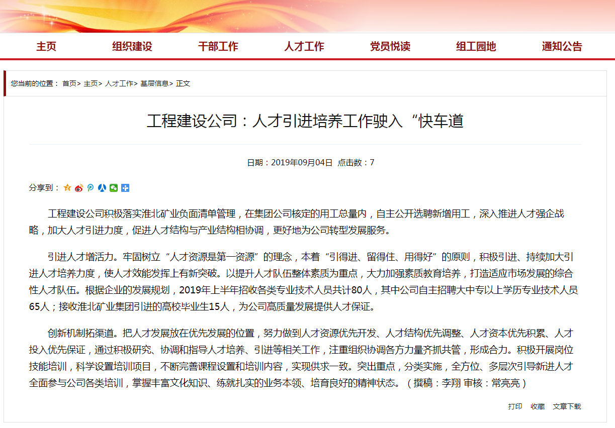 引進人才增活力。牢固樹立“人才資源是第一資源”的理念,本著“引得進、留得住、用得好”的原則,積極引進、持續加大引進人才培養力度,使人才效能發揮上有新突破。以提升人才隊伍整體素質為重點,大力加強素質教育培養,打造適應市場發展的綜合性人才隊伍。根據企業的發展規劃,2019年上半年招收各類專業技術人員共計80人,其中公司自主招聘大中專以上學歷專業技術人員65人;接收淮北礦業集團引進的高校畢業生15人,為公司高質量發展提供人才保證。