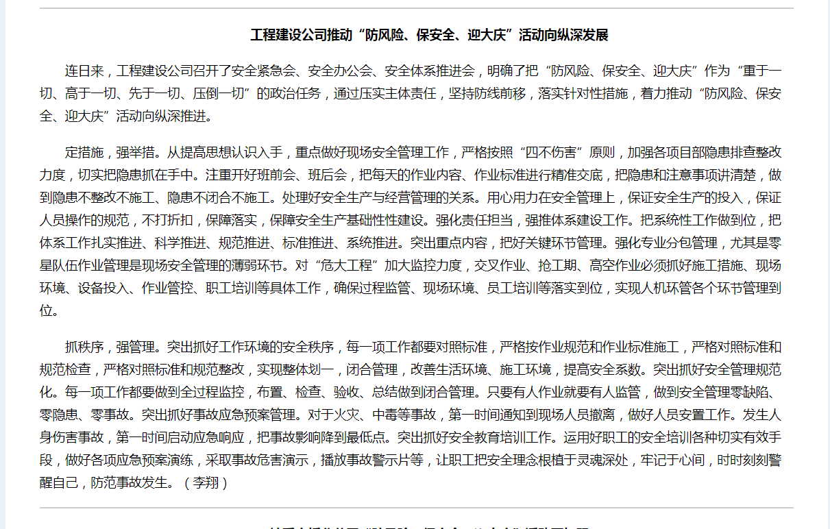 連日來,工程建設(shè)公司召開了安全緊急會(huì)、安全辦公會(huì)、安全體系推進(jìn)會(huì),明確了把“防風(fēng)險(xiǎn)、保安全、迎大慶”作為“重于一切、高于一切、先于一切、壓倒一切”的政治任務(wù),通過壓實(shí)主體責(zé)任,堅(jiān)持防線前移,落實(shí)針對(duì)性措施,著力推動(dòng)“防風(fēng)險(xiǎn)、保安全、迎大慶”活動(dòng)向縱深推進(jìn)。