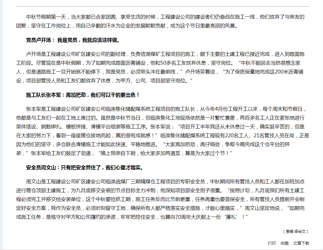 周文山是工程建設公司礦區建安公司臨渙選煤廠三期精煤倉工程項目的專職安全員,中秋期間所有管技人員和工人都在加班加點進行筒倉頂部土建施工,為九月底移交安裝的節點目標全力沖刺,他深知項目部安全擔子很重。“按照計劃,九月底我們所有土建工程必須完工并移交給安裝單位,這個中秋要搶抓工期,施工任務反而比節前更重,任務再重也要首保安全,所有管技人員提前開會制定好安全方案,我作為安全員,必須時刻留守工地,確保所有人都嚴格落實安全措施,才能心里踏實,”周文山堅定地說,“如期完成施工任務,是恪守對甲方和公司履約的承諾,牢牢把控住安全,也算向70周年大慶獻上一份‘薄禮’!”